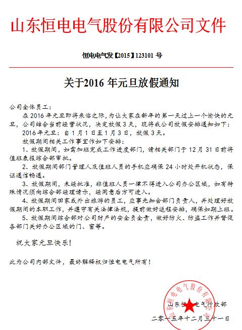 山東恒電電氣股份有限公司關(guān)于2016年元旦放假通知