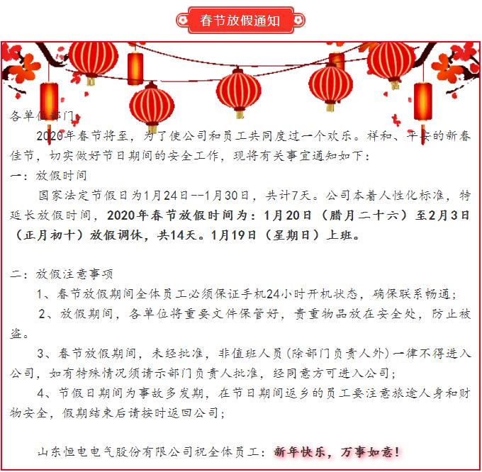 春節(jié)放假期間,如您有業(yè)務(wù)需求,可直接與您的銷售經(jīng)理取得聯(lián)系,放假期間只接受訂單,不安排發(fā)貨,2月3日恢復(fù)正常。非常感謝您的理解與支持,祝您春節(jié)愉快!